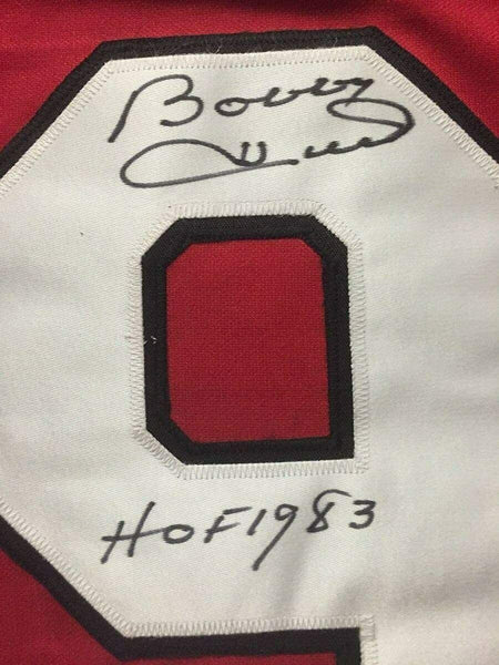 Framed Autographed/Signed Bobby Hull HOF 1983 33x42 Chicago Red Jersey JSA COA The item is professionally framed & matted with two 8x10 photos, measures 33"x42" and is ready to be hung in your man cave! NOTE: COA card will be mounted on the back of the frame, not inside it on top of the jersey as seen in the picture.