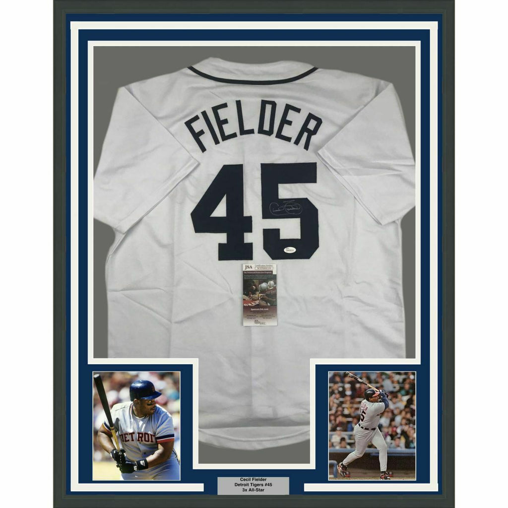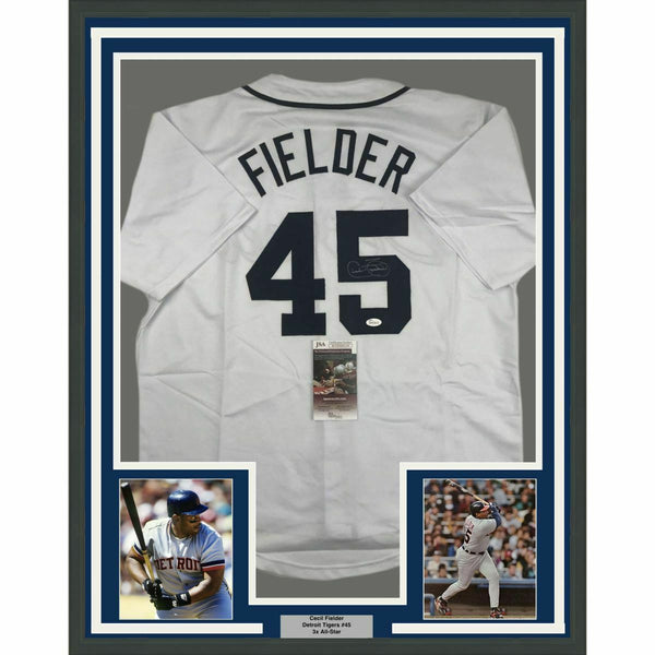 FRAMED Autographed/Signed CECIL FIELDER 33x42 Detroit White Jersey JSA COA Auto The item is professionally framed & matted with two 8x10 photos, measures 33"x42" and is ready to be hung in your man cave! NOTE: COA card will be mounted on the back of the frame, not inside it on top of the jersey as seen in the picture.