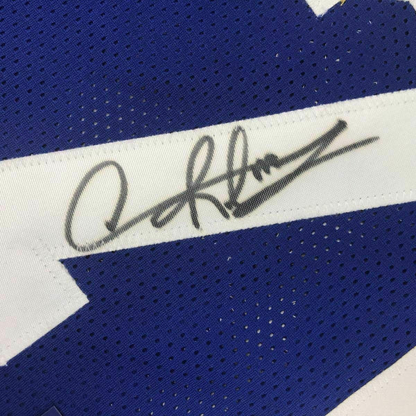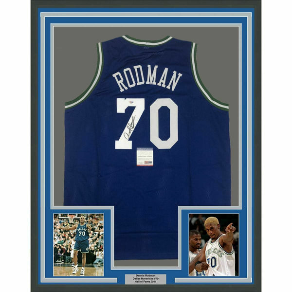 FRAMED Autographed/Signed DENNIS RODMAN 33x42 Dallas Blue Jersey PSA/DNA COA The item is professionally framed & matted with two 8x10 photos, measures 33"x42" and is ready to be hung in your man cave! NOTE: COA card will be mounted on the back of the frame, not inside it on top of the jersey as seen in the picture. Please allow up to 5 business days for the item to be framed, packaged safely, and picked up by USPS. Photo and matting requests can be made.