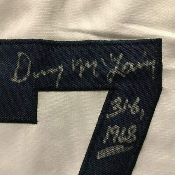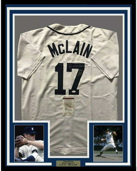 FRAMED Autographed/Signed DENNY MCLAIN 33x42 Detroit White Jersey JSA COA The item is professionally framed and matted with two 5x7 photos, measures 33x42 inches and is ready to be hung in your man cave! NOTE: COA card will be mounted on the back of the frame, not inside it on top of the jersey as seen in the picture.