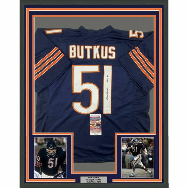 FRAMED Autographed/Signed DICK BUTKUS HOF 79 33x42 Chicago Blue Jersey JSA COA The item is professionally framed and matted with two 8x10 photos, measures 33x42 inches and is ready to be hung in your man cave! NOTE: COA card will be mounted on the back of the frame, not inside it on top of the jersey as seen in the picture. Please allow up to 5 business days for the item to be framed, packaged safely, and picked up by UPS. Photo and matting requests can be made.