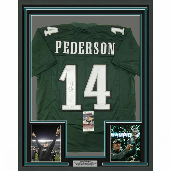 FRAMED Autographed/Signed DOUG PEDERSON 33x42 Philadelphia Green Jersey JSA COA The item is professionally framed & matted with two 8x10 photos, measures 33"x42" and is ready to be hung in your man cave! NOTE: COA card will be mounted on the back of the frame, not inside it on top of the jersey as seen in the picture. Please allow up to 5 business days for the item to be framed, packaged safely, and picked up by USPS. Photo and matting requests can be made.