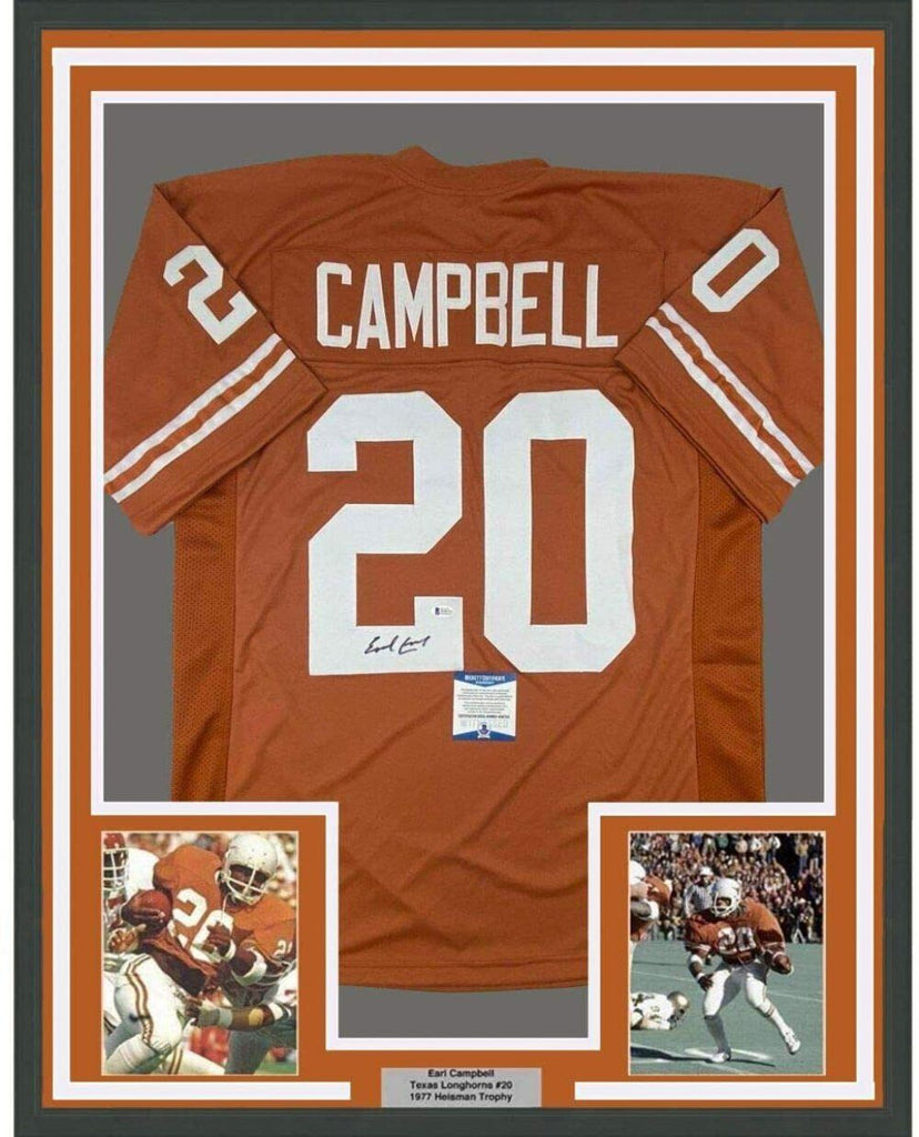 Framed Autographed/Signed Earl Campbell 35x39 Texas Orange Jersey Beckett COA The item is professionally framed and matted with two 5x7 photos, measures 35 inches by 39 inches and is ready to be hung in your man cave! Photo and matting requests can be made.
