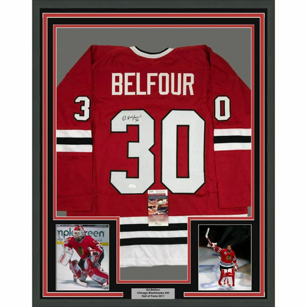FRAMED Autographed/Signed ED BELFOUR 33x42 Chicago Red Hockey Jersey JSA COA The item is professionally framed & matted with two 8x10 photos, measures 33"x42" and is ready to be hung in your man cave! NOTE: COA card will be mounted on the back of the frame, not inside it on top of the jersey as seen in the picture. Please allow up to 5 business days for the item to be framed, packaged safely, and picked up by USPS. Photo and matting requests can be made.
