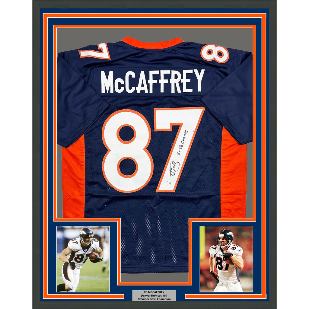 Framed Autographed/Signed Ed McCaffrey 35x39 2x SB Champs Blue Jersey BAS COA The item is professionally framed and matted with two 5x7 photos, measures 35x39 inches and is ready to be hung in your man cave! Photo and matting requests can be made.