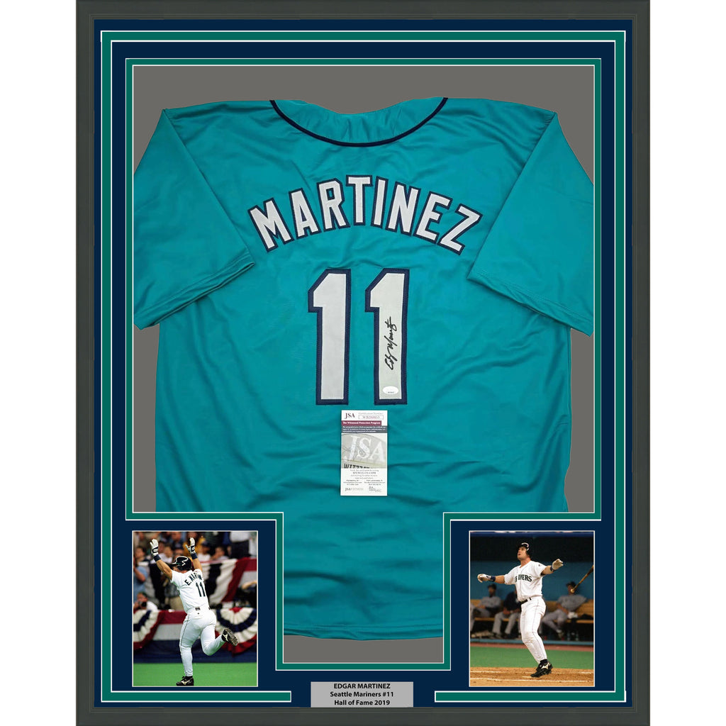 Framed Autographed/Signed Edgar Martinez 35x39 Seattle Teal Jersey JSA COA The item is professionally framed and matted with two 5x7 photos, measures 35x39 inches and is ready to be hung in your man cave! Photo and matting requests can be made.