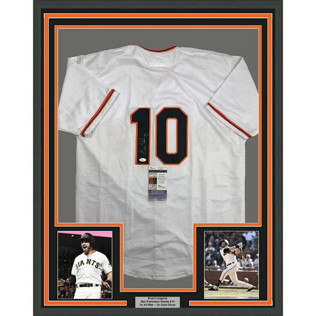 FRAMED Autographed/Signed EVAN LONGORIA 33x42 San Francisco White Jersey JSA COA The item is professionally framed & matted with two 8x10 photos, measures 33"x42" and is ready to be hung in your man cave! NOTE: COA card will be mounted on the back of the frame, not inside it on top of the jersey as seen in the picture. Please allow up to 5 business days for the item to be framed, packaged safely, and picked up by FedEx. Photo and matting requests can be made.