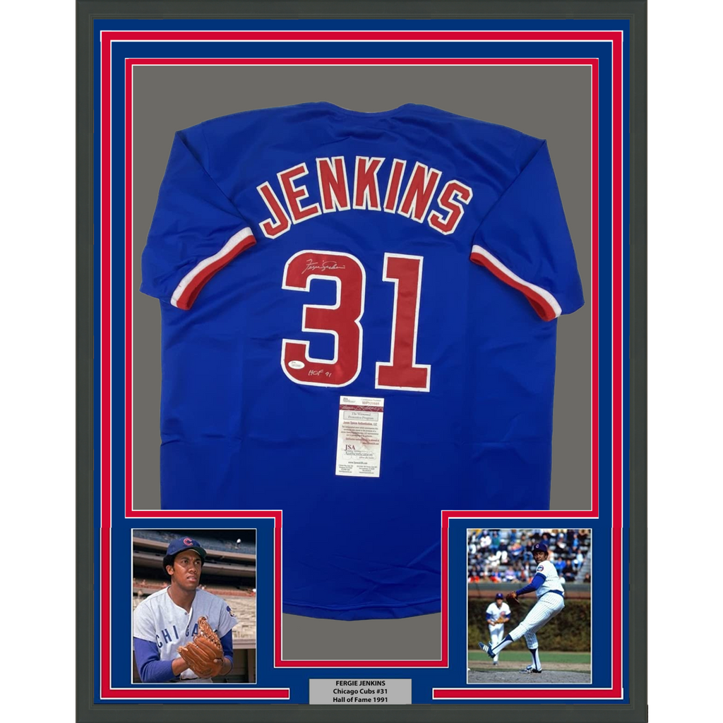 FRAMED Autographed/Signed FERGIE JENKINS 33x42 HOF 91 Blue Jersey JSA COA