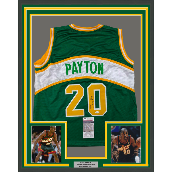 Framed Autographed/Signed Gary Payton 33x42 Seattle Green Jersey JSA COA The item is professionally framed and matted with two 5x7 photos, measures 35 inches by 39 inches and is ready to be hung in your man cave! Photo and matting requests can be made.