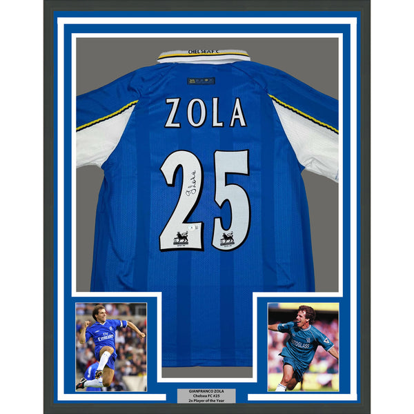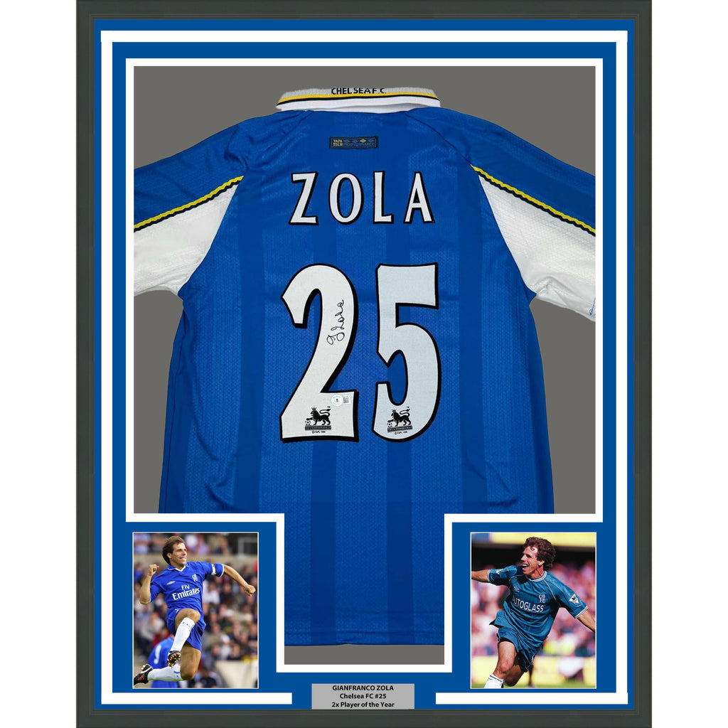 Framed Autographed/Signed Gianfranco Zola 35x39 Chelsea FC Blue Jersey BAS COA The item is professionally framed and matted with two 5x7 photos, measures 35x39 inches and is ready to be hung in your man cave! Photo and matting requests can be made.