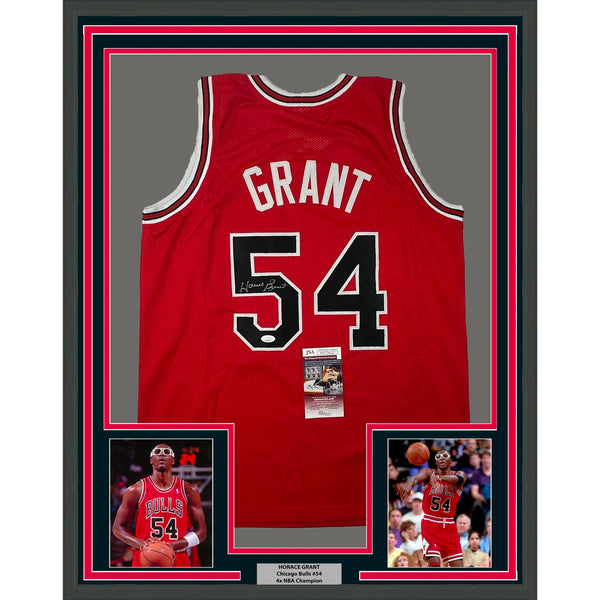 Framed Autographed/Signed Horace Grant 33x42 Chicago Red Jersey JSA COA The item is professionally framed and matted with two 5x7 photos, measures 35 inches by 39 inches and is ready to be hung in your man cave! Photo and matting requests can be made.