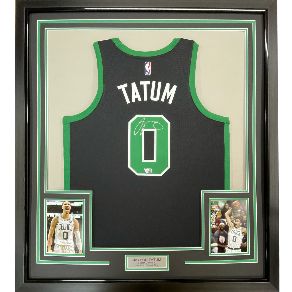 Framed Autographed/Signed Jayson Tatum 33x42 Black Authentic Jersey Fanatics COA The item is professionally framed and matted with two 5x7 photos, measures 35x39 inches and is ready to be hung in your man cave! Photo and matting requests can be made.