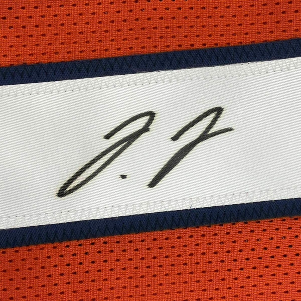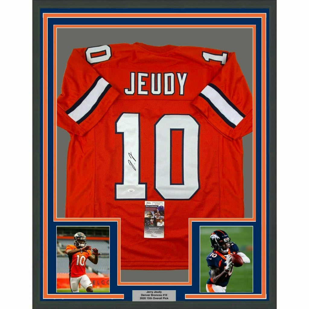 FRAMED Autographed/Signed JERRY JEUDY 33x42 Denver Retro Orange Jersey JSA COA The item is professionally framed & matted with two 8x10 photos, measures 33"x42" and is ready to be hung in your man cave! NOTE: COA card will be mounted on the back of the frame, not inside it on top of the jersey as seen in the picture.
