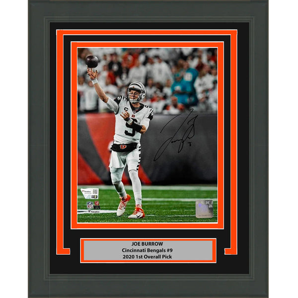 Framed Autographed/Signed Joe Burrow Cincinnati Bengals 8x10 Photo Fanatics COA The item is professionally framed & matted and is ready to be hung in your man cave! NOTE: COA card, if applicable, will be mounted on the back of the frame. Nameplate and matting requests can be made.