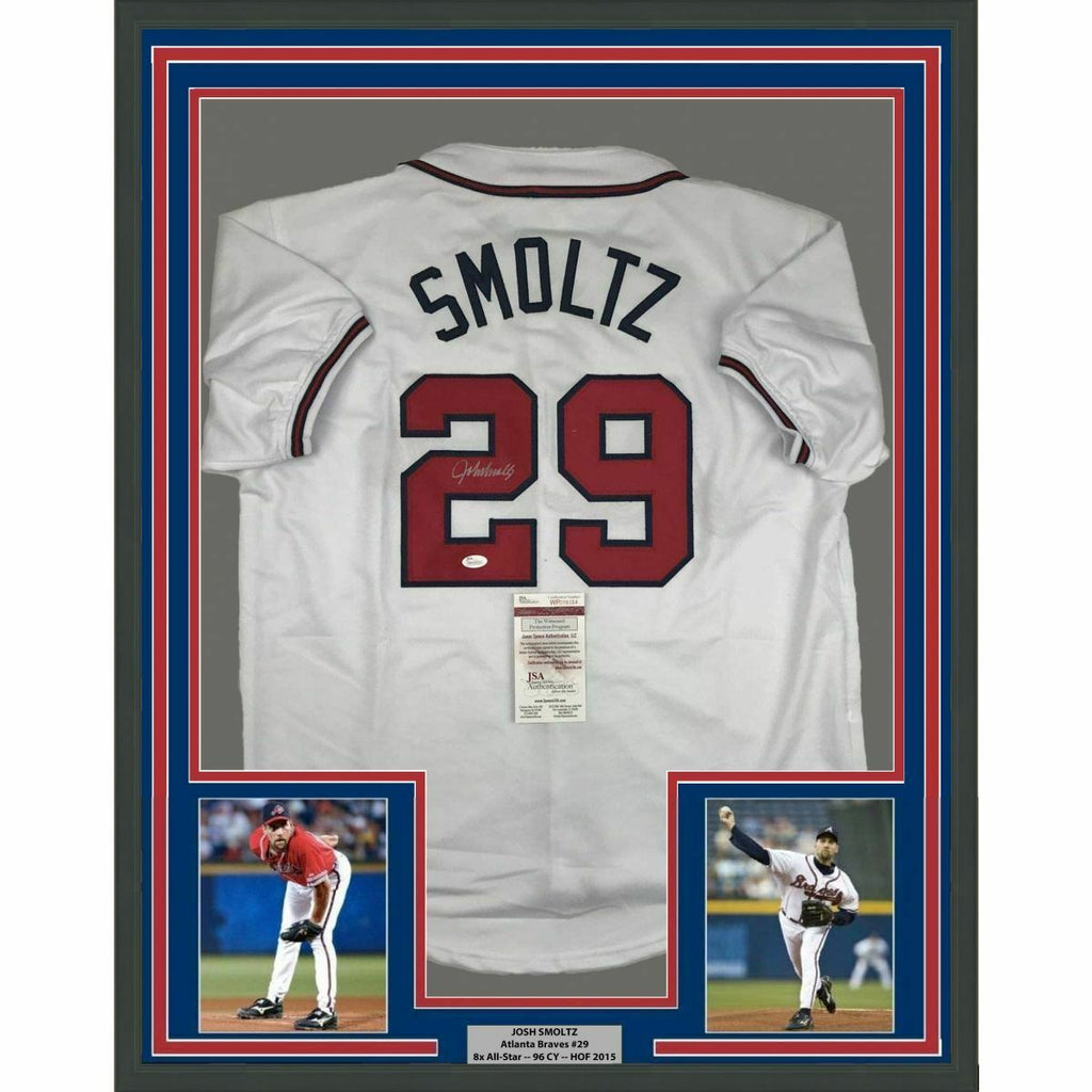 FRAMED Autographed/Signed JOHN SMOLTZ 33x42 Atlanta White Jersey JSA COA Auto The item is professionally framed and matted with two 8x10 photos, measures 33x42 inches and is ready to be hung in your man cave! NOTE: COA card will be mounted on the back of the frame, not inside it on top of the jersey as seen in the picture.