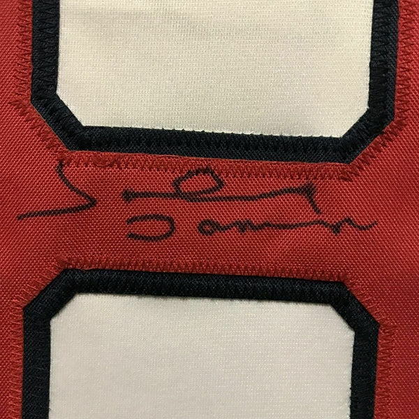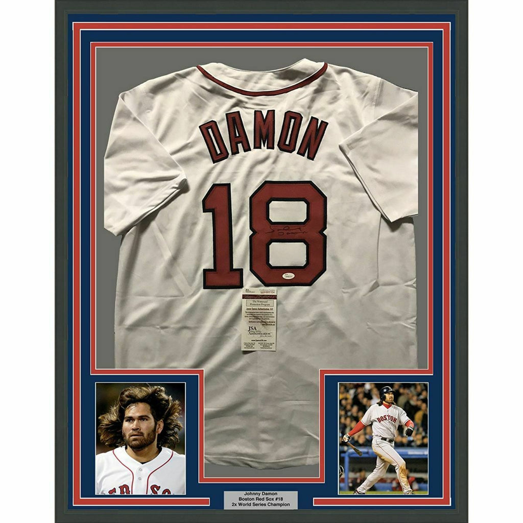 FRAMED Autographed/Signed JOHNNY DAMON 33x42 Boston White Jersey JSA COA Auto The item is professionally framed & matted with two 8x10 photos, measures 33"x42" and is ready to be hung in your man cave! NOTE: COA card will be mounted on the back of the frame, not inside it on top of the jersey as seen in the picture. Please allow up to 5 business days for the item to be framed, packaged safely, and picked up by FedEx. Photo and matting requests can be made.
