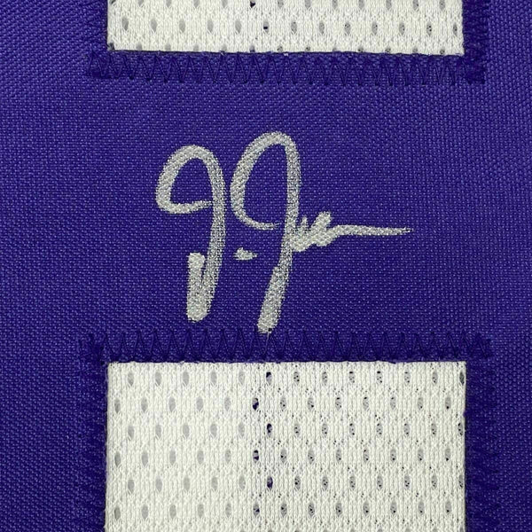 FRAMED Autographed/Signed JUSTIN JEFFERSON 33x42 Minnesota White Jersey JSA COA The item is professionally framed & matted with two 8x10 photos, measures 33"x42" and is ready to be hung in your man cave! NOTE: COA card will be mounted on the back of the frame, not inside it on top of the jersey as seen in the picture.