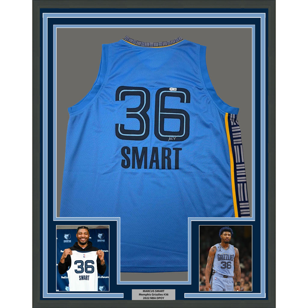 Framed Autographed/Signed Marcus Smart 33x42 Memphis Light Blue Jersey BAS COA The item is professionally framed and matted with two 5x7 photos, measures 35 inches by 39 inches and is ready to be hung in your man cave! Photo and matting requests can be made.