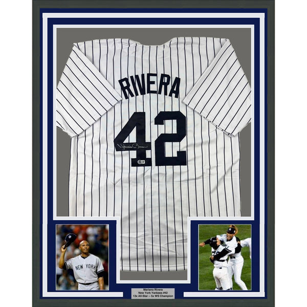 Framed Autographed/Signed Mariano Rivera 35x39 New York Jersey BAS COA Holo The item is professionally framed and matted with two 5x7 photos, measures 35x39 inches and is ready to be hung in your man cave! Photo and matting requests can be made.