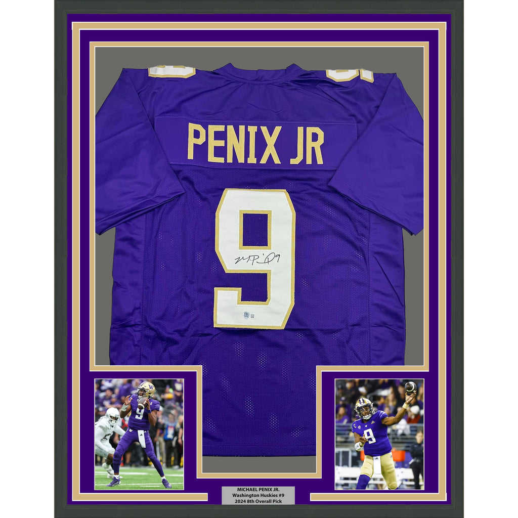 Framed Autographed/Signed Michael Penix Jr. 35x39 Huskies Purple Jersey BAS COA The item is professionally framed and matted with two 5x7 photos, measures 35x39 inches and is ready to be hung in your man cave! Photo and matting requests can be made.
