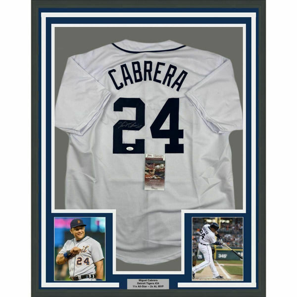 FRAMED Autographed/Signed MIGUEL CABRERA 33x42 Detroit White Jersey JSA COA Auto The item is professionally framed & matted with two 8x10 photos, measures 33"x42" and is ready to be hung in your man cave! NOTE: COA card will be mounted on the back of the frame, not inside it on top of the jersey as seen in the picture. Please allow up to 5 business days for the item to be framed, packaged safely, and picked up by USPS. Photo and matting requests can be made.
