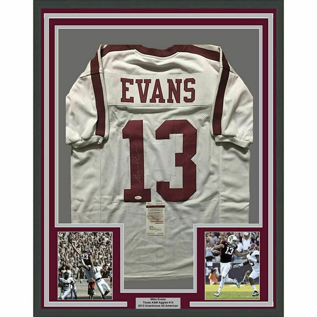 FRAMED Autographed/Signed MIKE EVANS 33x42 Texas A&M White Jersey JSA COA Auto The item is professionally framed & matted with two 8x10 photos, measures 33"x42" and is ready to be hung in your man cave! NOTE: COA card will be mounted on the back of the frame, not inside it on top of the jersey as seen in the picture. Please allow up to 5 business days for the item to be framed, packaged safely, and picked up by FedEx. Photo and matting requests can be made.