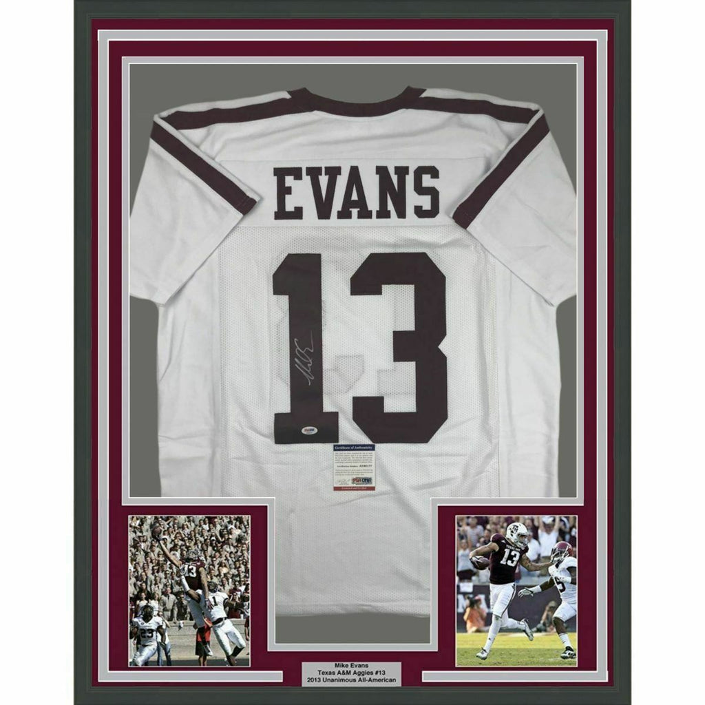 FRAMED Autographed/Signed MIKE EVANS 33x42 Texas A&M White Jersey PSA/DNA COA The item is professionally framed & matted with two 8x10 photos, measures 33"x42" and is ready to be hung in your man cave! NOTE: COA card will be mounted on the back of the frame, not inside it on top of the jersey as seen in the picture. Please allow up to 5 business days for the item to be framed, packaged safely, and picked up by USPS. Photo and matting requests can be made.