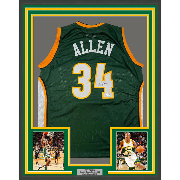 Framed Autographed/Signed Ray Allen 33x42 Seattle Green Jersey Beckett BAS COA The item is professionally framed and matted with two 5x7 photos, measures 35 inches by 39 inches and is ready to be hung in your man cave! Photo and matting requests can be made.