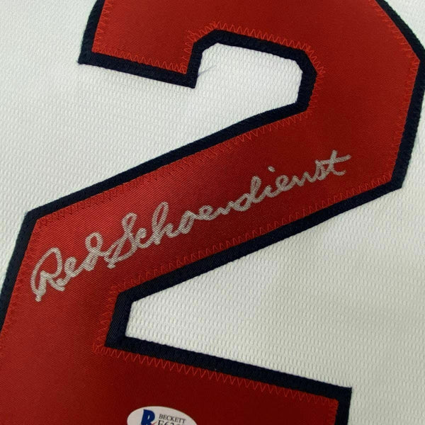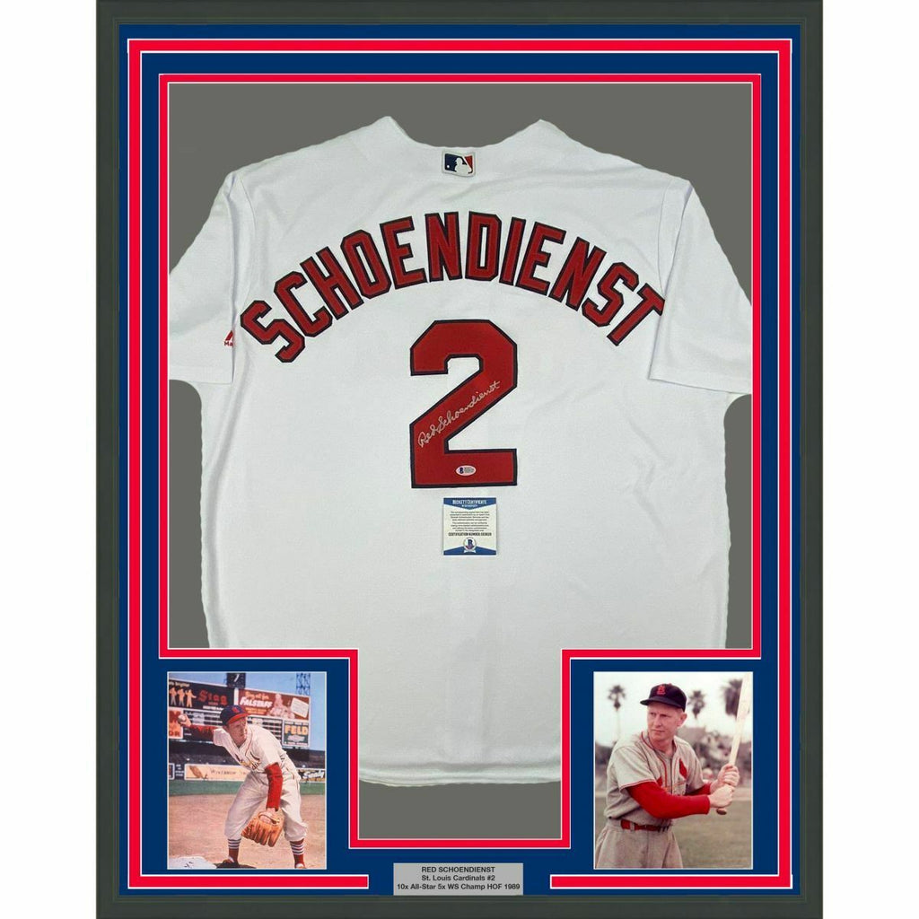 FRAMED Autographed/Signed RED SCHOENDIENST 33x42 St. Louis White Jersey BAS COA The item is professionally framed & matted with two 8x10 photos, measures 33"x42" and is ready to be hung in your man cave! NOTE: COA card will be mounted on the back of the frame, not inside it on top of the jersey as seen in the picture. Please allow up to 5 business days for the item to be framed, packaged safely, and picked up by UPS. Photo and matting requests can be made.