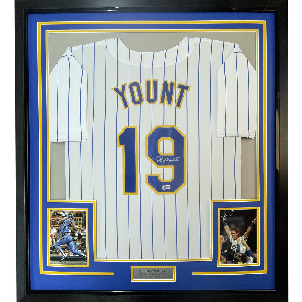 Framed Autographed/Signed Robin Yount 35x39 Milwaukee Pinstripe Jersey JSA COA The item is professionally framed and matted with two 5x7 photos, measures 35 inches by 39 inches and is ready to be hung in your man cave! Photo and matting requests can be made.