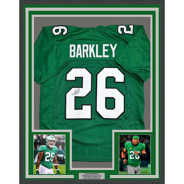Framed Autographed/Signed Saquon Barkley 35x39 Kelly Green Jersey JSA COA The item is professionally framed and matted with two 5x7 photos, measures 35x39 inches and is ready to be hung in your man cave! Photo and matting requests can be made.