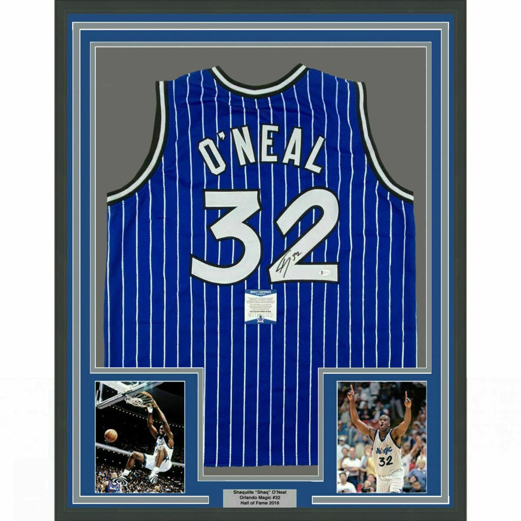 FRAMED Autographed/Signed SHAQUILLE O'NEAL 33x42 Orlando Blue Jersey Beckett COA The item is professionally framed & matted with two 8x10 photos, measures 33"x42" and is ready to be hung in your man cave! NOTE: COA card will be mounted on the back of the frame, not inside it on top of the jersey as seen in the picture.