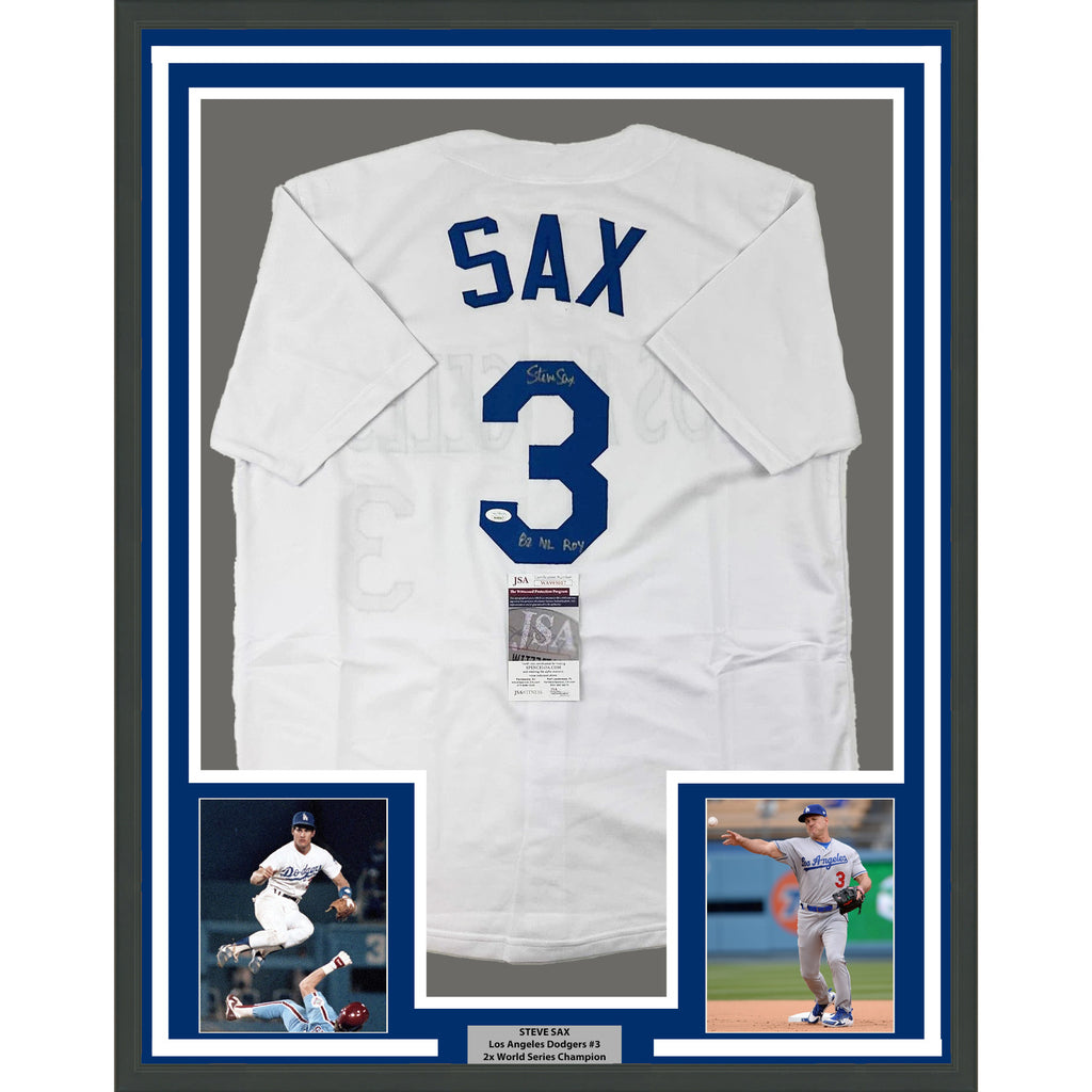 Framed Autographed/Signed Steve Sax 33x42 Los Angeles LA White Jersey JSA COA The item is professionally framed and matted with two 5x7 photos, measures 35 inches by 39 inches and is ready to be hung in your man cave! Photo and matting requests can be made.