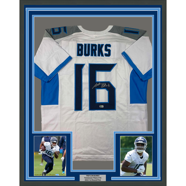 Framed Autographed/Signed Treylon Burks 33x42 Tennessee White Jersey BAS COA The item is professionally framed & matted with two 5x7 photos, measures 33"x42" and is ready to be hung in your man cave! NOTE: COA card will be mounted on the back of the frame, not inside it on top of the jersey as seen in the picture.