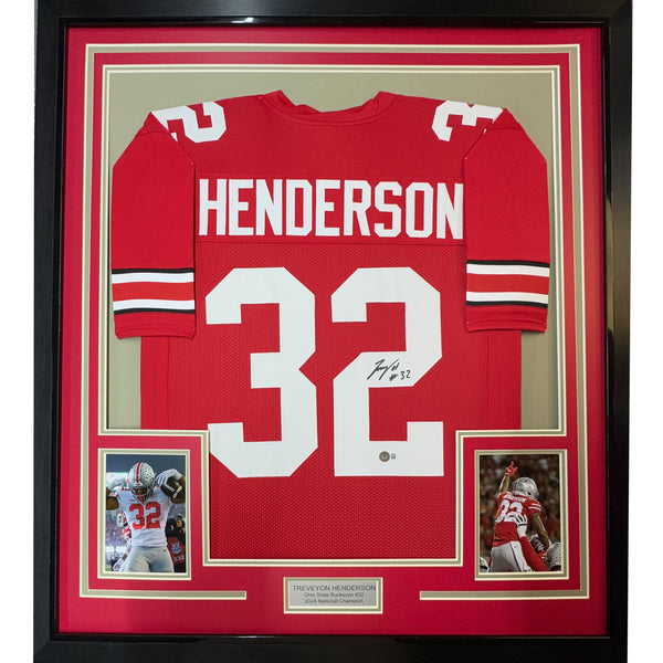 Framed Autographed/Signed Treyveon Henderson 35x39 Ohio State Red Jersey BAS COA The item is professionally framed and matted with two 5x7 photos, measures 35x39 inches and is ready to be hung in your man cave! Photo and matting requests can be made.