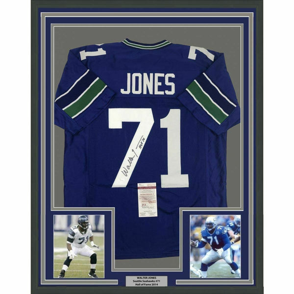 FRAMED Autographed/Signed WALTER JONES HOF 14 33x42 Seattle Blue Jersey JSA COA The item is professionally framed and matted with two 8x10 photos, measures 33x42 inches and is ready to be hung in your man cave! NOTE: COA card will be mounted on the back of the frame, not inside it on top of the jersey as seen in the picture.