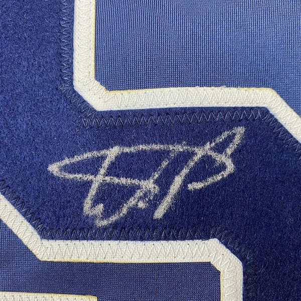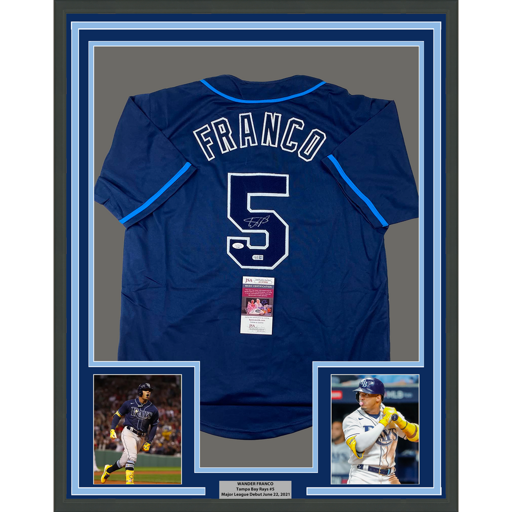 Framed Autographed/Signed Wander Franco 33x42 Tampa Bay Dark Blue Jersey JSA COA The item is professionally framed & matted with two 8x10 photos, measures 33"x42" and is ready to be hung in your man cave! NOTE: COA card will be mounted on the back of the frame, not inside it on top of the jersey as seen in the picture.