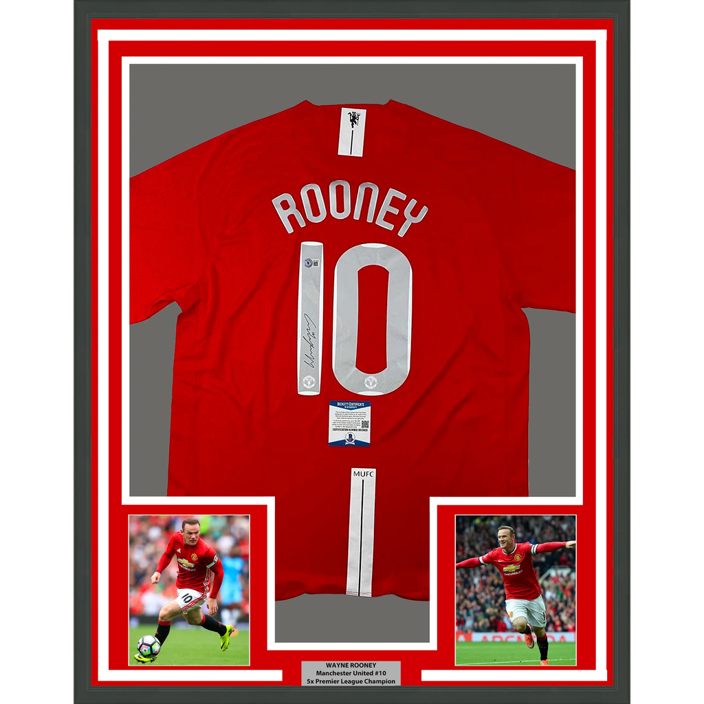 Framed Autographed/Signed Wayne Rooney 33x42 Manchester Red 2008 Jersey BAS COA The item is professionally framed and matted with two 5x7 photos, measures 35x39 inches and is ready to be hung in your man cave! Photo and matting requests can be made.