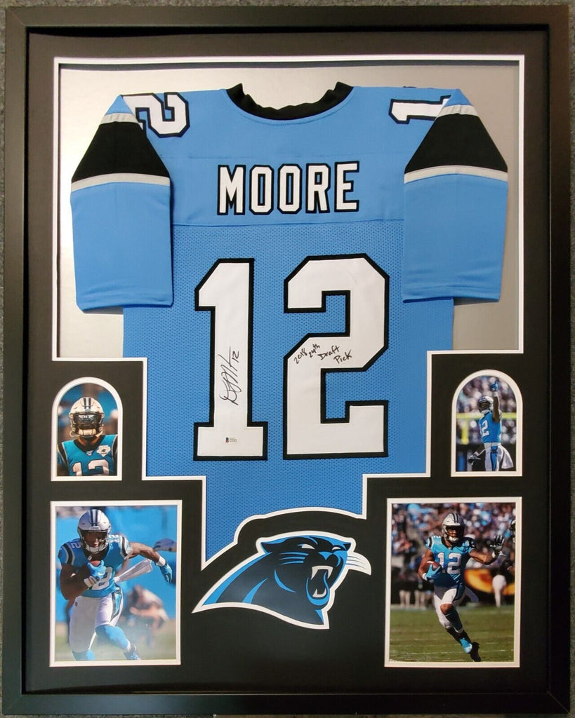 Custom Framed DJ Moore hand signed Carolina Panthers style custom jersey."2018 24th Draft Pick" InscribedBeckett Hologram and COA The jersey has fully stitched numbers on the front and back, no logos or tags. It is a great item and a must for all great sports fans!Stock photos are used for auctions. Will receive equal quality.This item is professionally framed, it measures 32"x40" inside , 42"x34" outside , using UV protective Acrylic glass for safe keeping and safe transport, team color matting, black moulding and hanging hooks on the back. All additional items in frame seen in pictures included. 100% ready to hang in your fan cave.