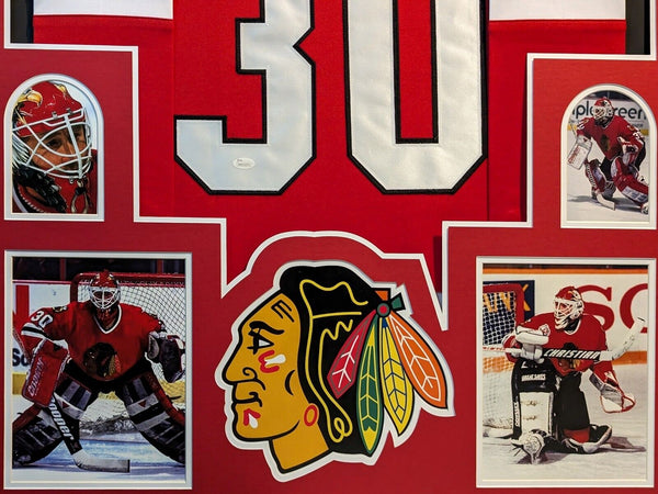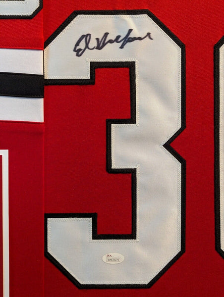 Custom Framed Ed Belfour hand signed Chicago Blackhawks custom jersey. JSA COA The authentication is from JSA. This signature is WITNESSED by a representative of JSA! 100% AUTHENTIC!!! The jersey has fully stitched numbers on the front and back. It is a great item and a must for all great sports fans! This item is professionally framed, it measures 32"x40" inside , 42"x34" outside , using UV protective Acrylic glass for safe keeping and safe transport, team color matting, black moulding and hanging hooks on the back. All additional items in frame seen in pictures included. 100% ready to hang in your fan cave.