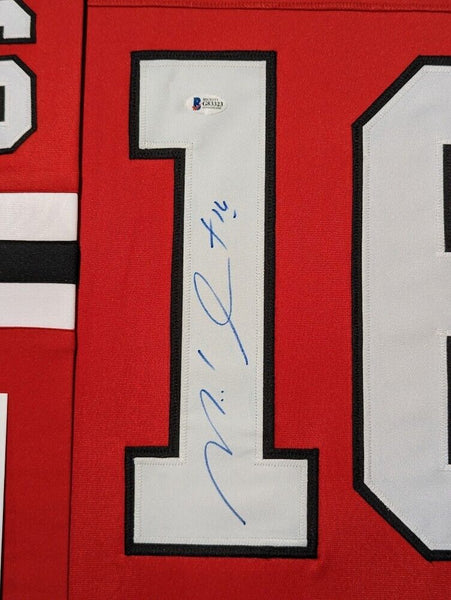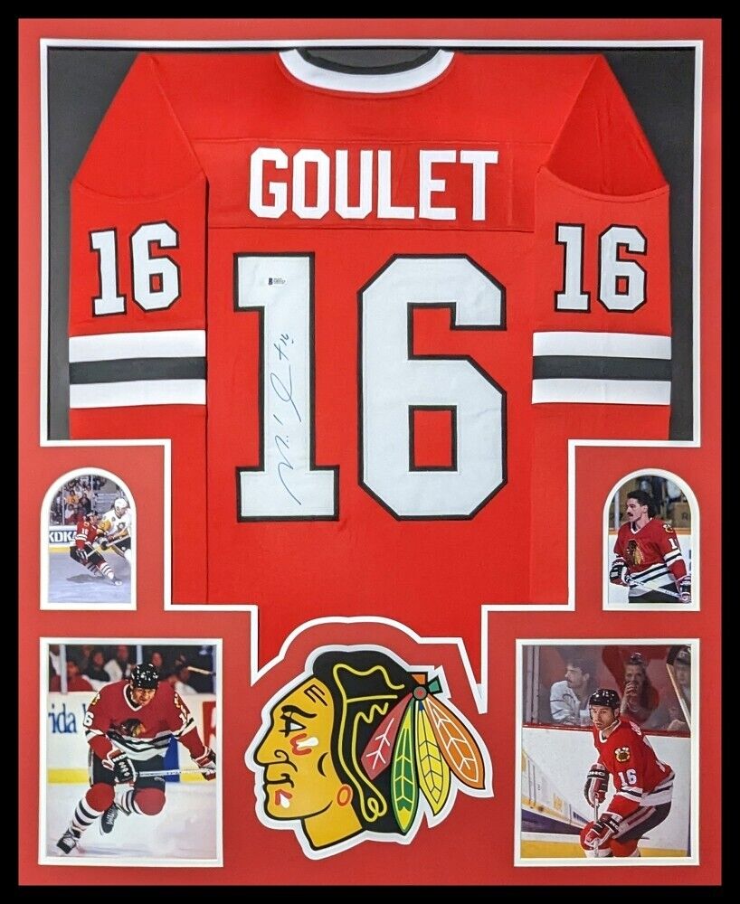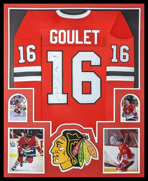 Custom Framed Michel Goulet hand signed Chicago Blackhawks custom jersey. Beckett Hologram and COA The authentication is from Beckett. This signature is WITNESSED by a representative of Beckett! 100% AUTHENTIC!!! The jersey has fully stitched numbers on the front and back. It is a great item and a must for all great sports fans! This item is professionally framed, it measures 32"x40" inside , 42"x34" outside , using UV protective Acrylic glass for safe keeping and safe transport, team color matting, black moulding and hanging hooks on the back. All additional items in frame seen in pictures included. 100% ready to hang in your fan cave.