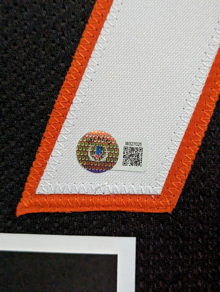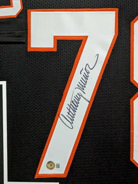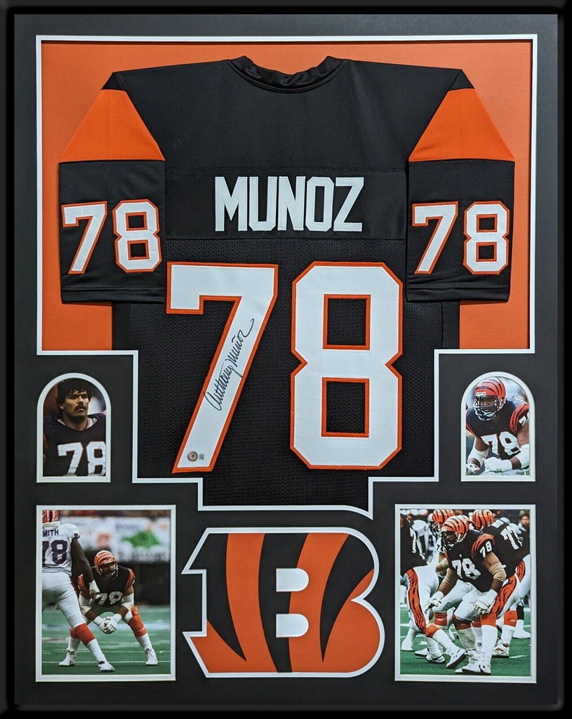 Custom Framed Anthony Munoz hand signed Cincinnati Bengals style custom jersey. Beckett Holo The authentication is from Beckett. This signature is authenticated by a representative of Beckett! 100% AUTHENTIC!!! The jersey has fully stitched numbers on the front and back. It is a great item and a must for all great sports fans! This item is professionally framed, it measures 32"x40" inside , 42"x34" outside , using UV protective Acrylic glass for safe keeping and safe transport, team color matting, black moulding and hanging hooks on the back. All additional items in frame seen in pictures included. 100% ready to hang in your fan cave.