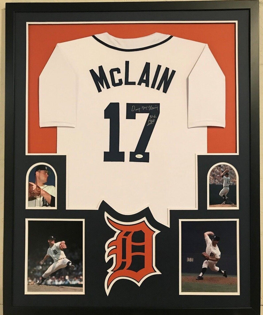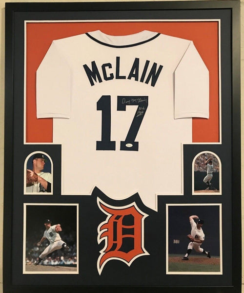Custom Framed Denny McLain hand signed inscribed "31-6, 1968" Detroit Tigers custom jersey.JSA Hologram and COA(#WP787358)The authentication is from JSA. This signature is not authenticated by opinion but it is WITNESSED by a representative of JSA! 100% AUTHENTIC!!! The jersey has fully stitched numbers on the front and back. It is a great item and a must for all great sports fans!This item is professionally framed, it measures 32"x40" inside , 42"x34" outside , using UV protective Acrylic glass for safe keeping and safe transport, team color matting, black moulding and hanging hooks on the back. All additional items in frame seen in pictures included. 100% ready to hang in your fan cave.
