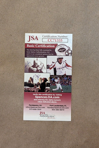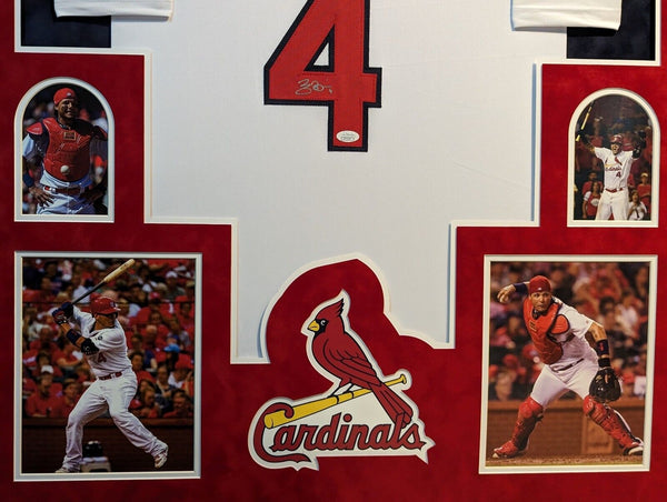 Framed in SUEDE Yadier Molina St Louis Cardinals style Custom Jersey. JSA Hologram and COAThe authentication is from JSA. This signature is authenticated by a representative of JSA! 100% AUTHENTIC!!! The jersey has fully stitched numbers on the front and back. No tags or logos. This is not an official NFL jersey but it is very high quality. It is a great item and a must for all great sports fans! This item is professionally framed, it measures 32"x40" inside , 42"x34" outside , using UV protective Acrylic glass for safe keeping and safe transport, SUEDE team color matting, black moulding and hanging hooks on the back. All additional items in frame seen in pictures included. 100% ready to hang in your fan cave.