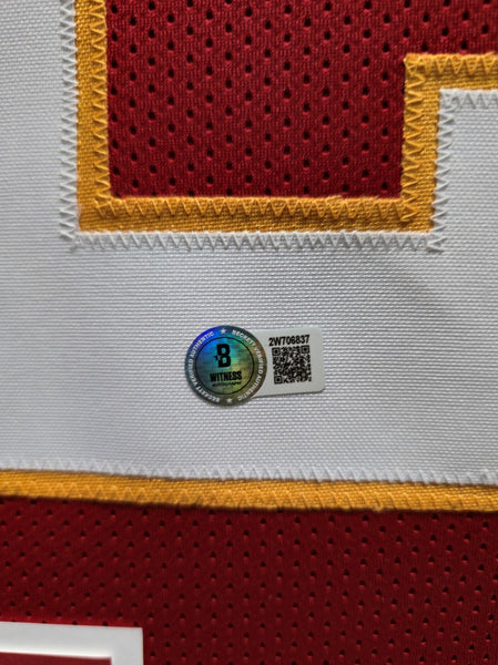 Custom Framed Jamaal Charles hand signed Kansas City Chiefs style custom jersey. Beckett Hologram The authentication is from Beckett. This signature is WITNESSED by a representative of Beckett! 100% AUTHENTIC!!! The jersey has fully stitched numbers on the front and back. It is a great item and a must for all great sports fans! This item is professionally framed, it measures 32"x40" inside , 42"x34" outside , using UV protective Acrylic glass for safe keeping and safe transport, team color matting, black moulding and hanging hooks on the back. All additional items in frame seen in pictures included. 100% ready to hang in your fan cave.