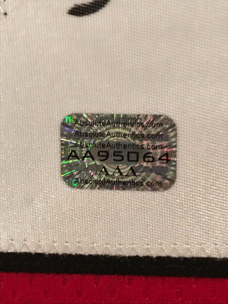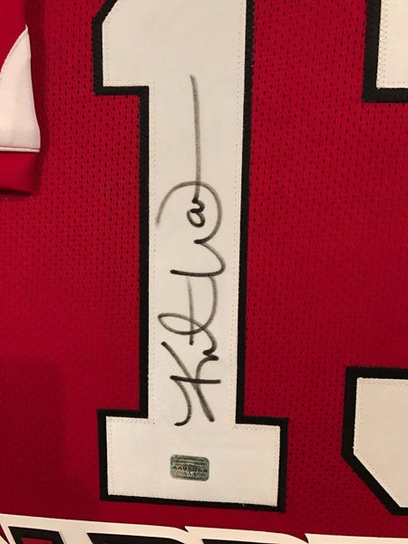 Framed Kurt Warner hand signed Arizona Cardinals jersey.AAA Hologram (#AA95064)Cert card is missing, holo onlyThe authentication is from AAA. This signature is authenticated by a representative of AAA! 100% AUTHENTIC!!! The jersey has fully stitched numbers on the front and back. No tags or logos. This is not an official NFL jersey but it is very high quality. It is a great item and a must for all great sports fans!This item is professionally framed, it measures 32"x40" inside , 42"x34" outside , using UV protective Acrylic glass for safe keeping and safe transport, team color matting, black moulding and hanging hooks on the back. All additional items in frame seen in pictures included. 100% ready to hang in your fan cave.