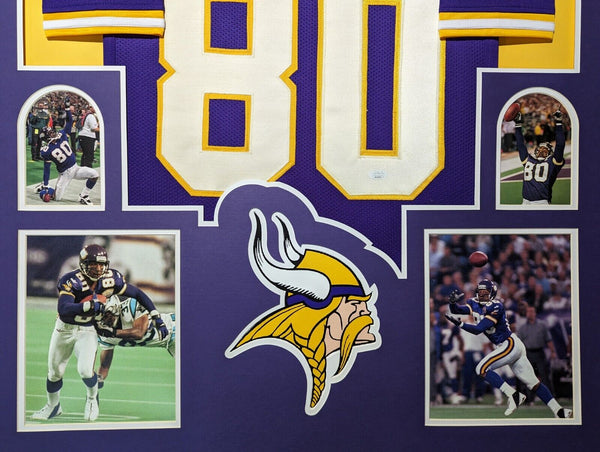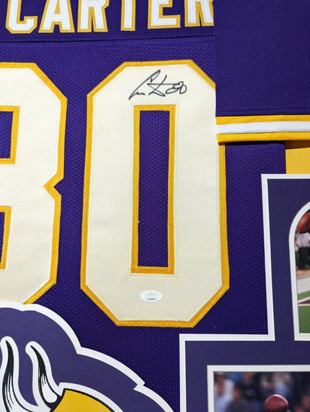 Custom Framed Cris Carter hand signed Minnesota Vikings style custom jersey.JSA COAThe authentication is from JSA. This signature is authenticated by a representative of JSA! 100% AUTHENTIC!!! The jersey has fully stitched numbers on the front and back. It is a great item and a must for all great sports fans!This item is professionally framed, it measures 32"x40" inside , 42"x34" outside , using UV protective Acrylic glass for safe keeping and safe transport, team color SUEDE matting, black moulding and hanging hooks on the back. All additional items in frame seen in pictures included. 100% ready to hang in your fan cave.