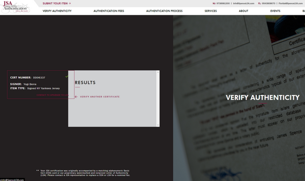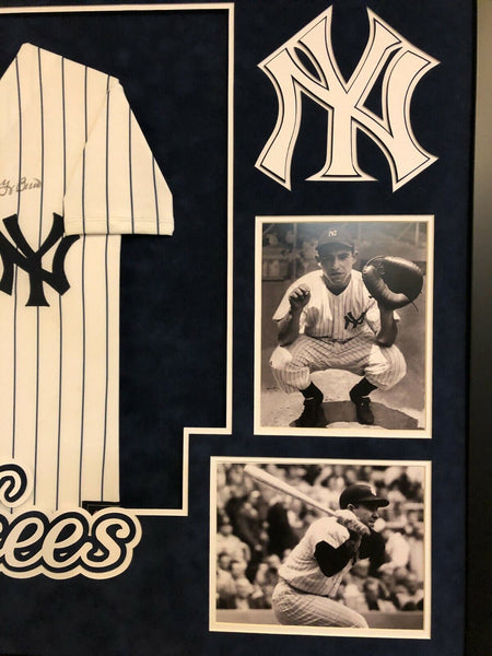 Custom Framed Yogi Berra hand signed N.Y. Yankees custom jersey.COA Card Missing but sticker included. Screenshot attached of the included and valid certification sticker as verified on the JSA WebsiteJSA Hologram and COA(#DD06337)The authentication is from JSA. This signature is not authenticated by opinion but it is WITNESSED by a representative of JSA! 100% AUTHENTIC!!! The jersey has fully stitched numbers on the front and back. It is a great item and a must for all great sports fans!This item is professionally framed, it measures 32"x40" inside , 42"x34" outside , using UV protective Acrylic glass for safe keeping and safe transport, team SUEDE color matting, black moulding and hanging hooks on the back. All additional items in frame seen in pictures included. 100% ready to hang in your fan cave.