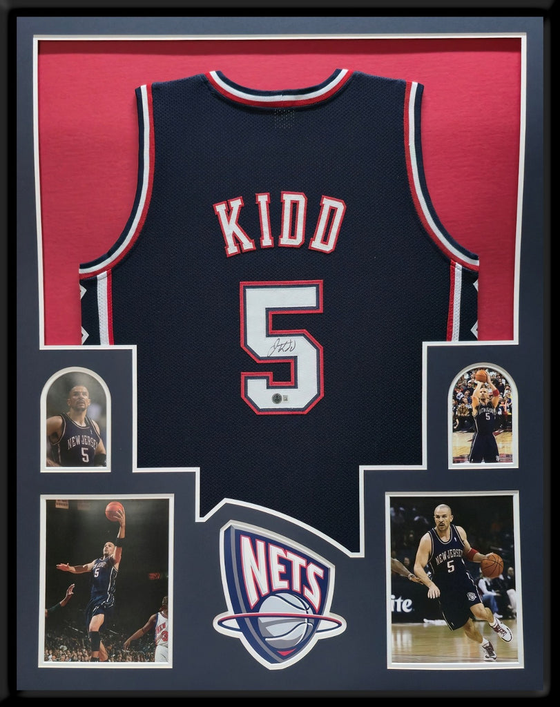 Custom Framed Jason Kidd hand signed New Jersey Nets style custom jersey Beckett Hologram The authentication is from Beckett. This signature is WITNESSED by a representative of Beckett! 100% AUTHENTIC!!! The jersey has fully stitched numbers on the front and back. It is a great item and a must for all great sports fans! This item is professionally framed, it measures 32"x40" inside , 42"x34" outside , using UV protective Acrylic glass for safe keeping and safe transport, team color matting, black moulding and hanging hooks on the back. All additional items in frame seen in pictures included. 100% ready to hang in your fan cave.