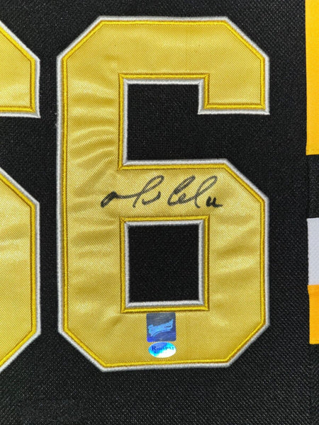 Custom Framed in SUEDE Mario Lemieux hand signed Pittsburgh Penguins style custom jersey. Frameworth Hologram The authentication is from Frameworth. This signature is WITNESSED by a representative of Frameworth! 100% AUTHENTIC!!! The jersey has fully stitched numbers on the front and back. It is a great item and a must for all great sports fans! This item is professionally framed, it measures 32"x40" inside , 42"x34" outside , using UV protective Acrylic glass for safe keeping and safe transport, SUEDE team color matting, black moulding and hanging hooks on the back. All additional items in frame seen in pictures included. 100% ready to hang in your fan cave.